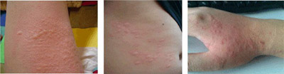 作为一种变应性病变,过敏性荨麻疹系荨麻疹的主要类型。典型的过敏性荨麻疹表现为大小不等的鲜红色风团,呈圆形、椭圆形或不规则形,多孤立散在,亦可融合成片。但如微血管内血清渗出急剧,压迫管壁,风团可呈苍白色,表面毛孔显著如桔皮样。数小时内水肿减轻,风团变为红斑而渐消失,但新的风团陆续发生,此伏彼起,一日之内可多次发生。